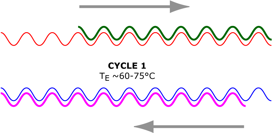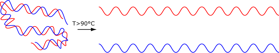 At temperatures above 90ยฐC, double-stranded DNA denatures or “melts”. That means the weak hydrogen bonds that usually hold the two complementary strands together at normal temperatures are disrupted resulting in two single-stranded DNA strands (shown below in an idealised form).