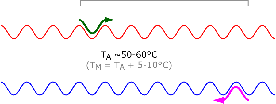 At the annealing temperature (TA), primers that collide with their complementary sequence can hybridise or “bind” to it. The chance of such an encounter happening is increased because we use a vast excess of each primer in the reaction mixture compared to the number of template molecules present.