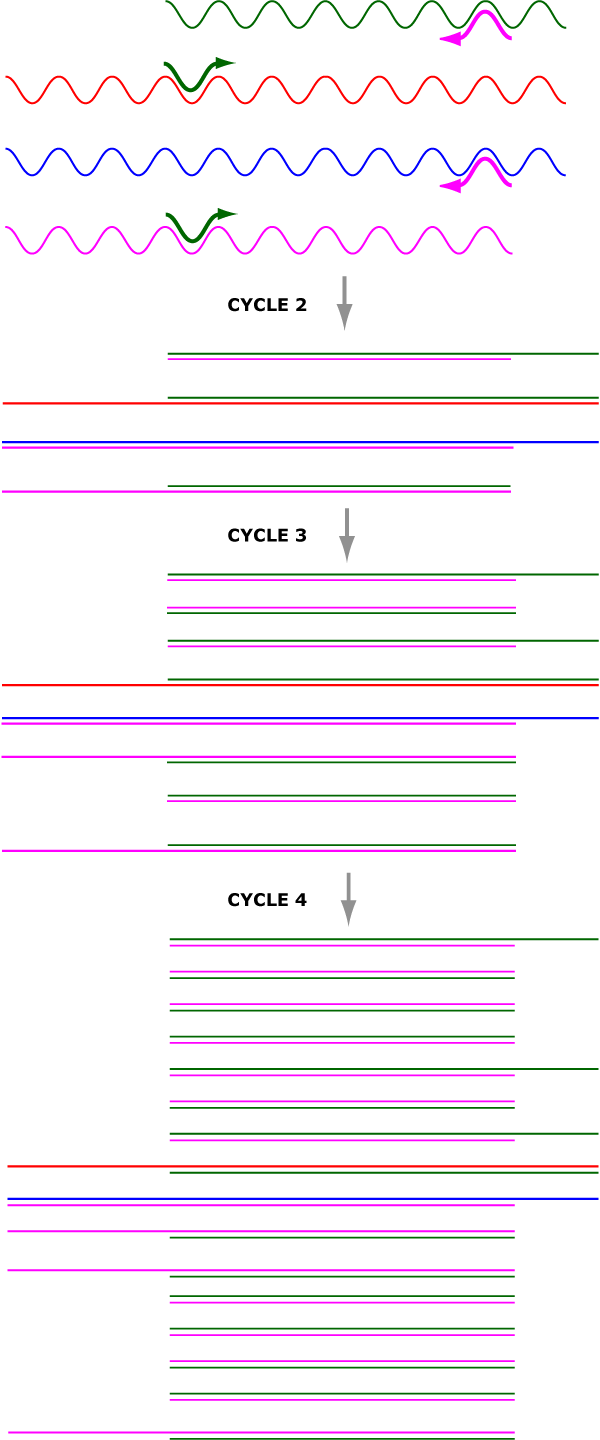 Firstly, the original template strands (blue and red) continue to act as templates because the PCR process is not destructive. Secondly, each cycle produces a greater number of the shorter amplicon molecules. Notably, these are shorter in our example because the primers bind within the template sequence (which might, for example, be an entire very long gene) – the ends bits don’t get copied.